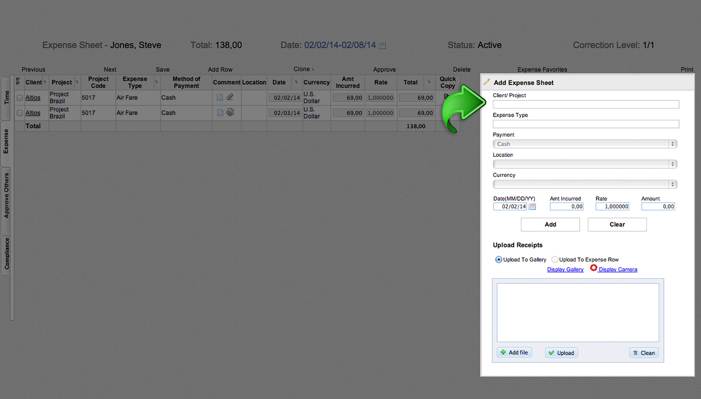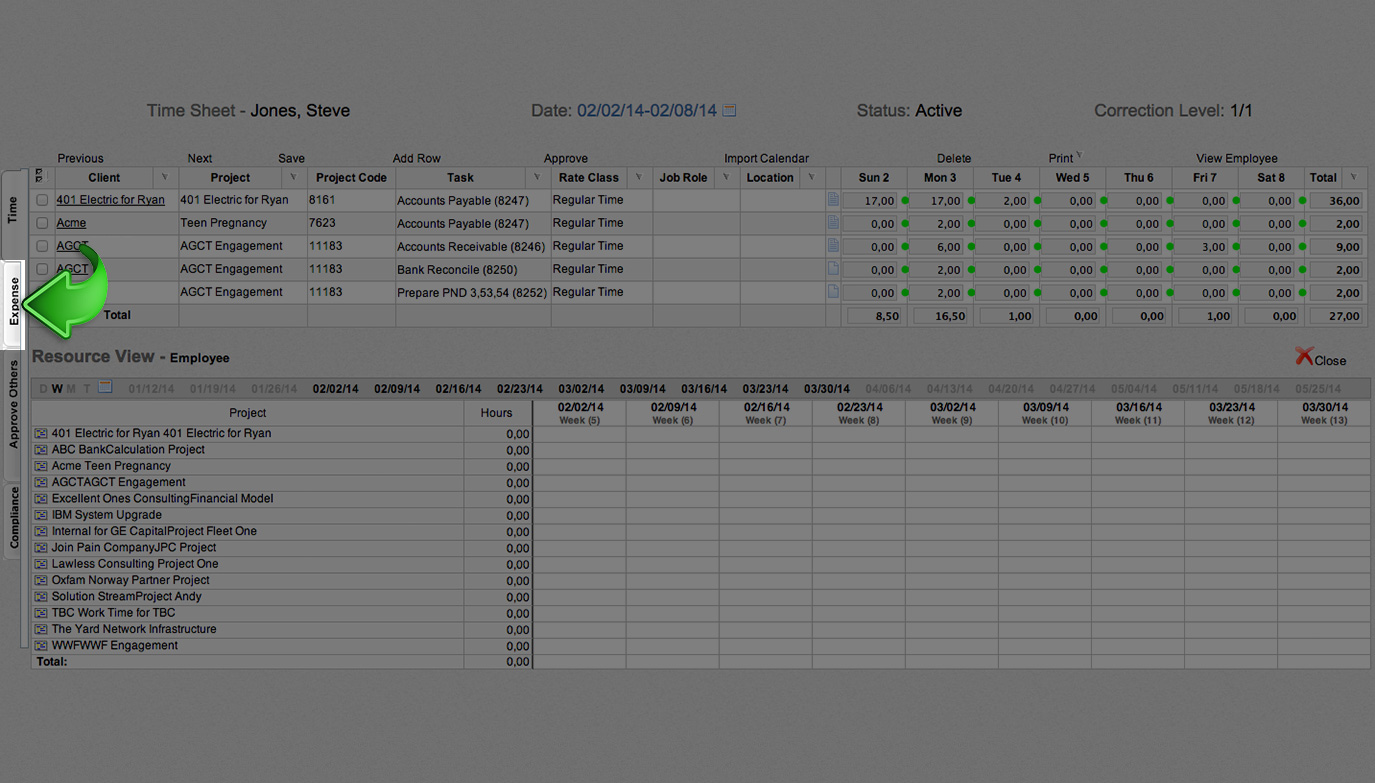 To begin, click the “Time” tab. This takes you to your main interface, which provides tabs for time entry, expense entry, management approval, and compliance.